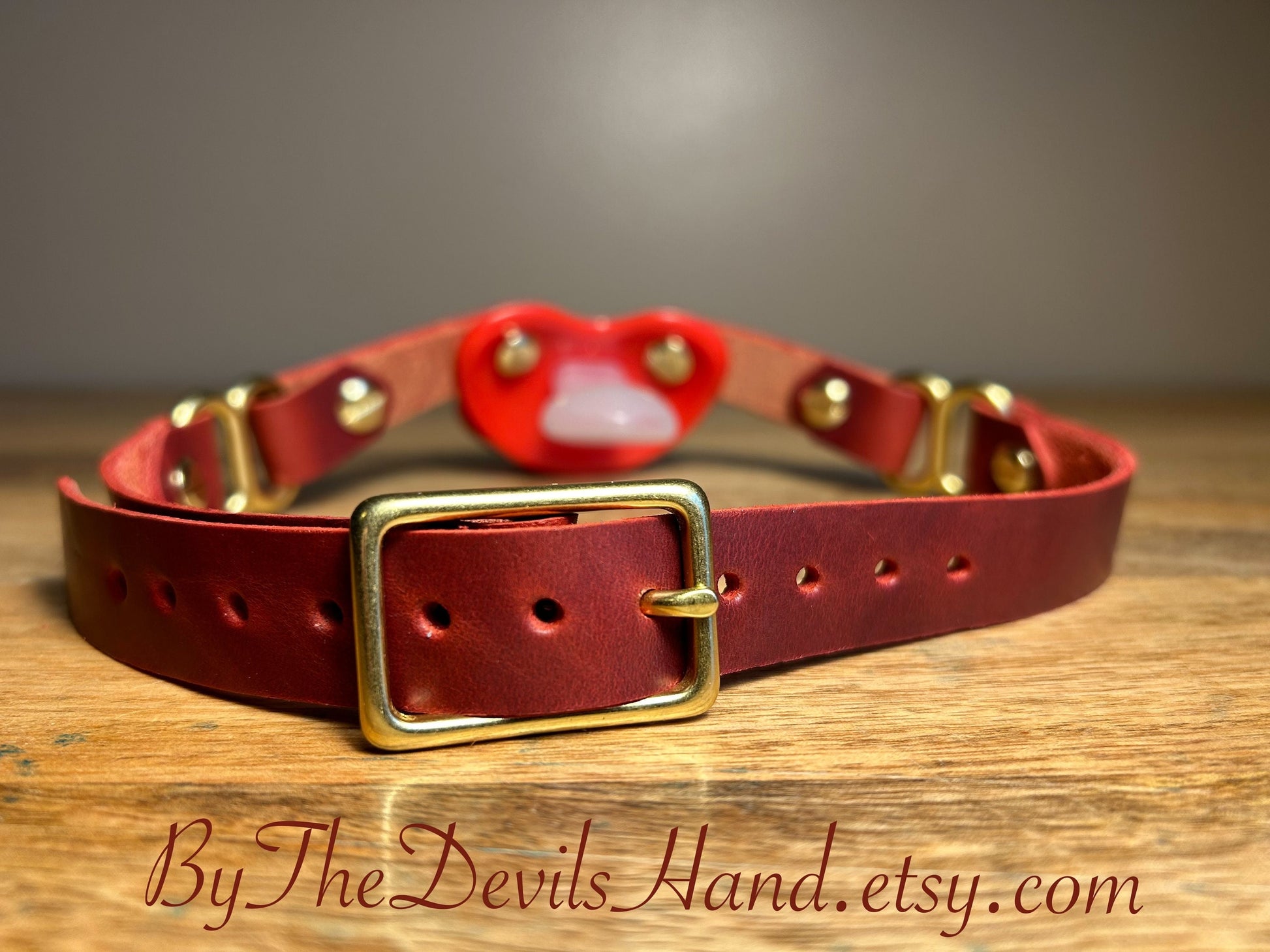 Adult Size Pacifier Gag W/ Handmade Cavalier London Bus Red Straps (CBR-BE) Brass Hardware