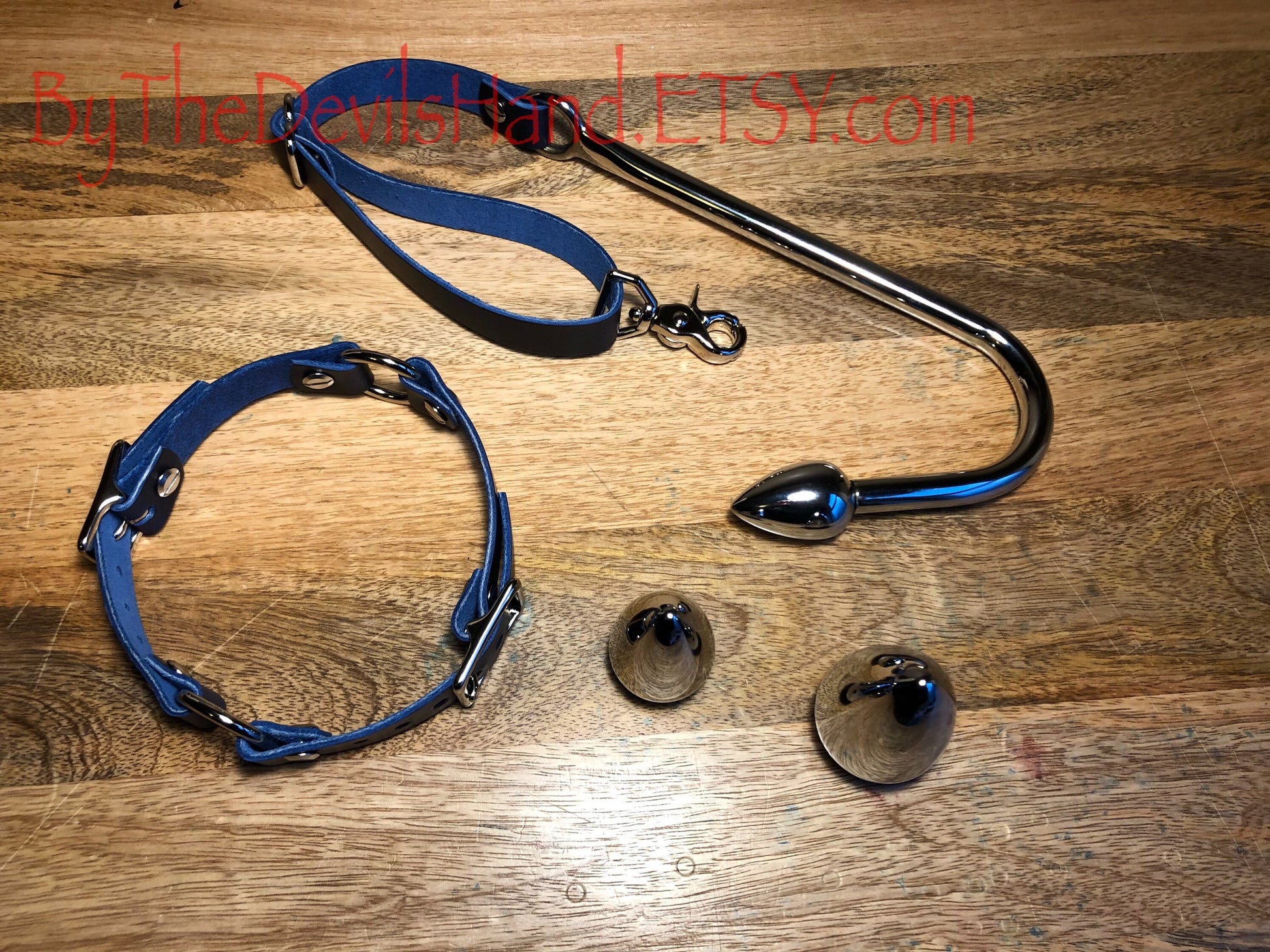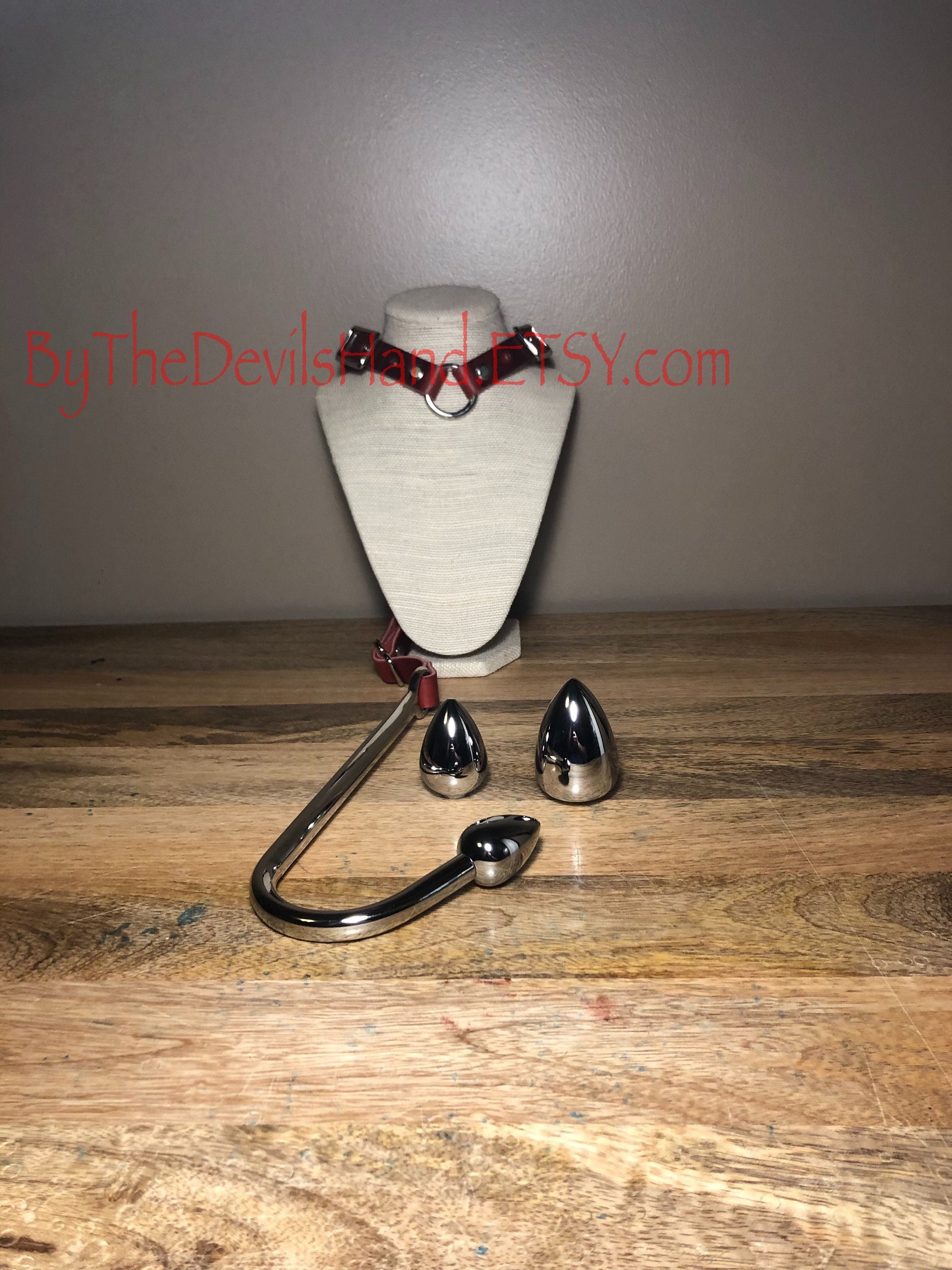 Anal hook with bondage rig to fasten the hook to your person/slave/sub’s neck. Back strap allows the hook to be tightened and fitted as desired. Collar is removable to be used independent of the rig, hook is removable as well to be used on its own.