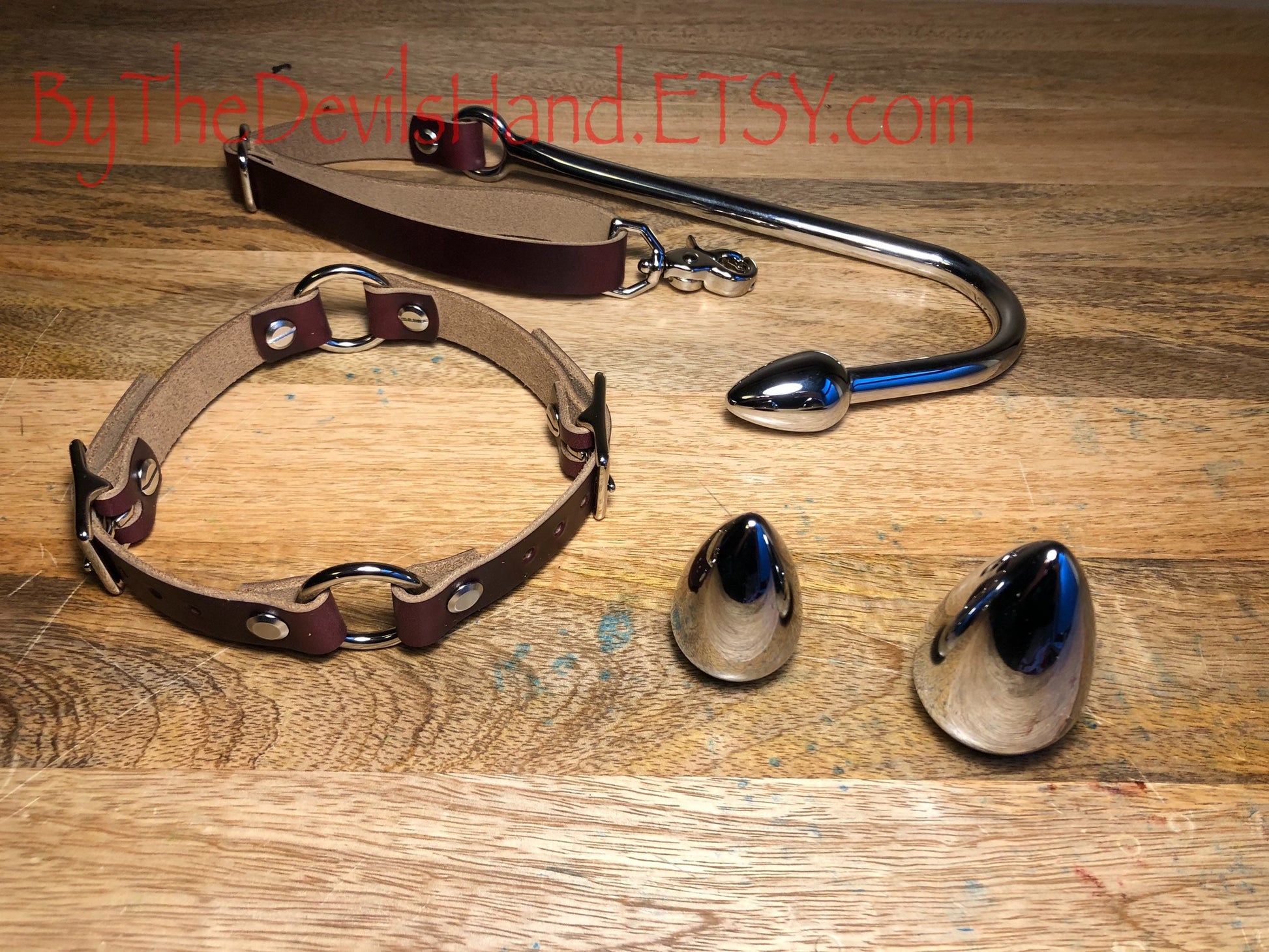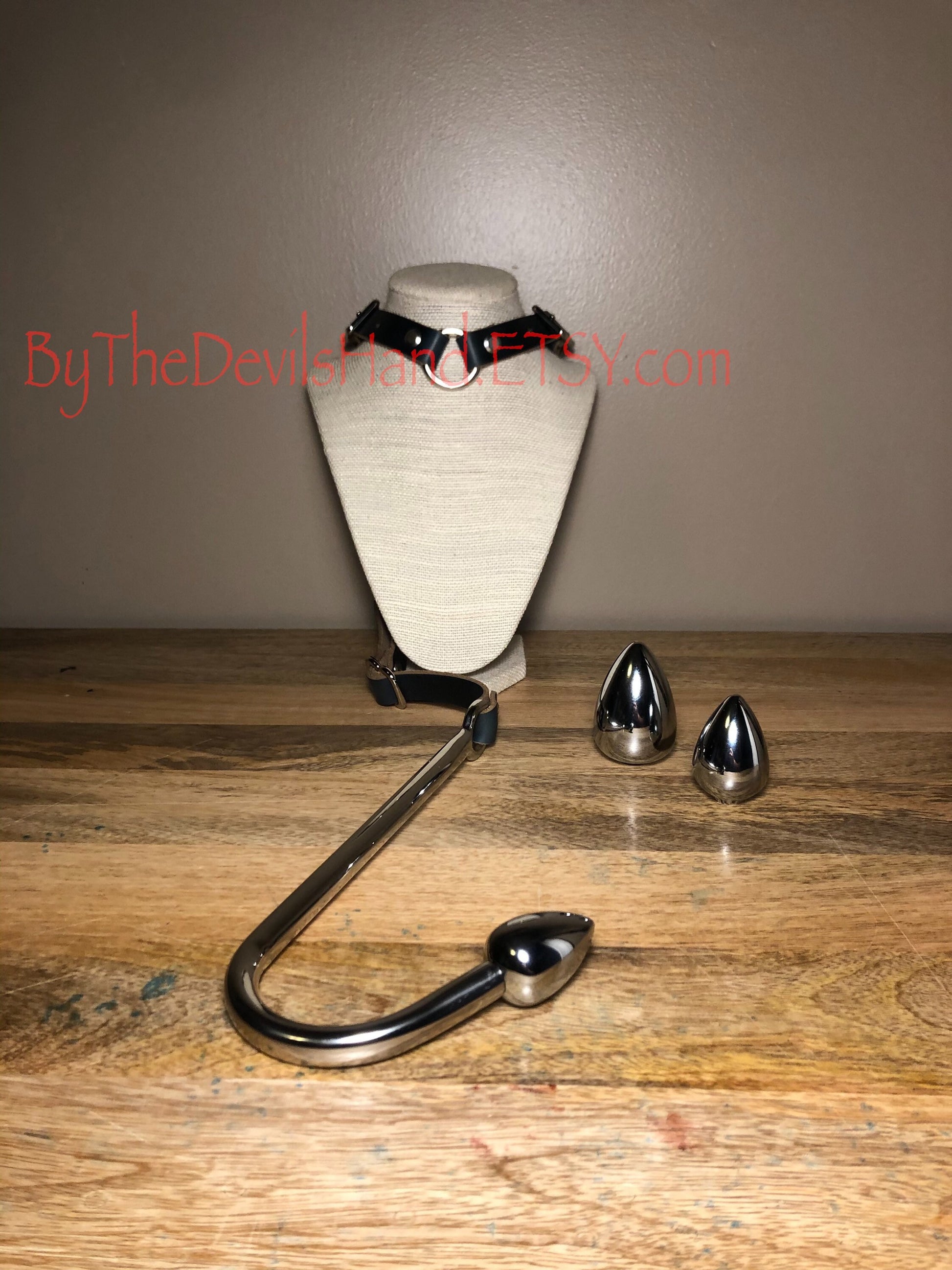 Anal hook with bondage rig to fasten the hook to your person/slave/sub’s neck. Back strap allows the hook to be tightened and fitted as desired. Collar is removable to be used independent of the rig, hook is removable as well to be used on its own.