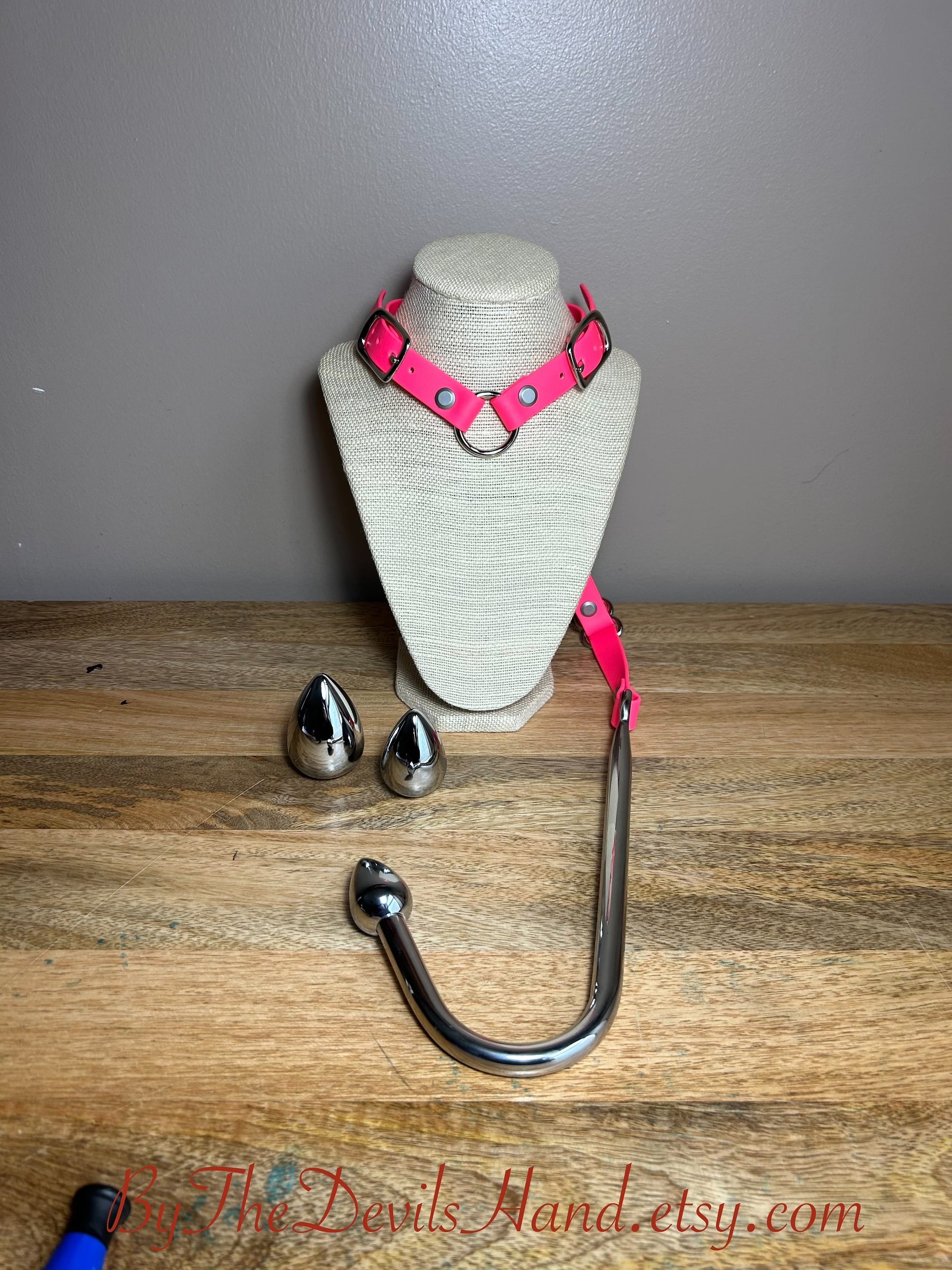 Anal hook with bondage rig to fasten the hook to your person/slave/sub’s neck. Back strap allows the hook to be tightened and fitted as desired. Collar is removable to be used independent of the rig, hook is removable as well.