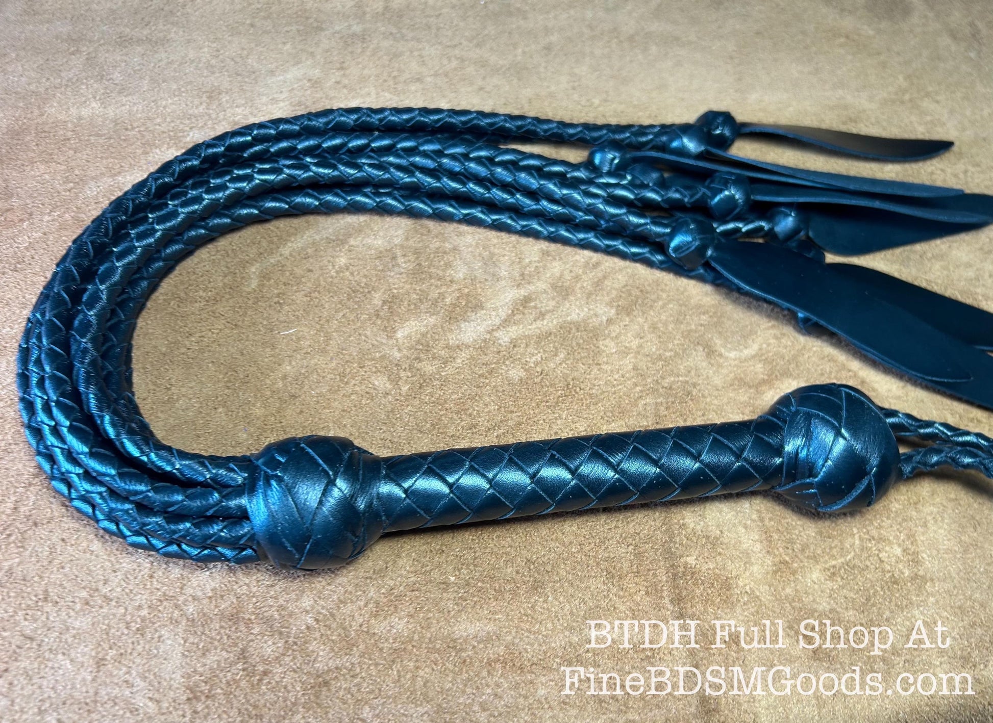 Handmade in New Jersey, top quality leather flogger with nine wide dagger shaped leather tips followed by a braided leather ball to attach the whip’y tip to the long braided falls.