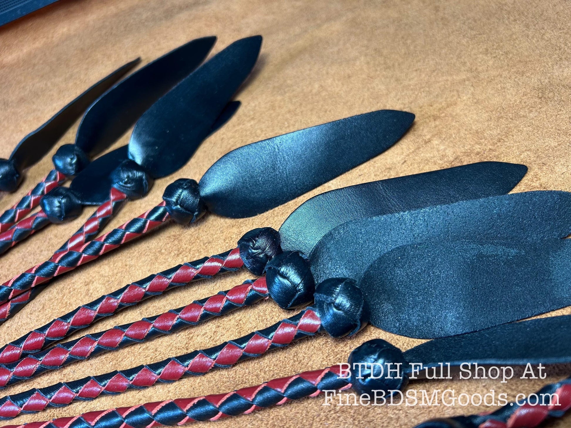 Handmade in New Jersey, top quality leather flogger with nine wide dagger shaped leather tips followed by a braided leather ball to attach the whip’y tip to the long braided falls.
