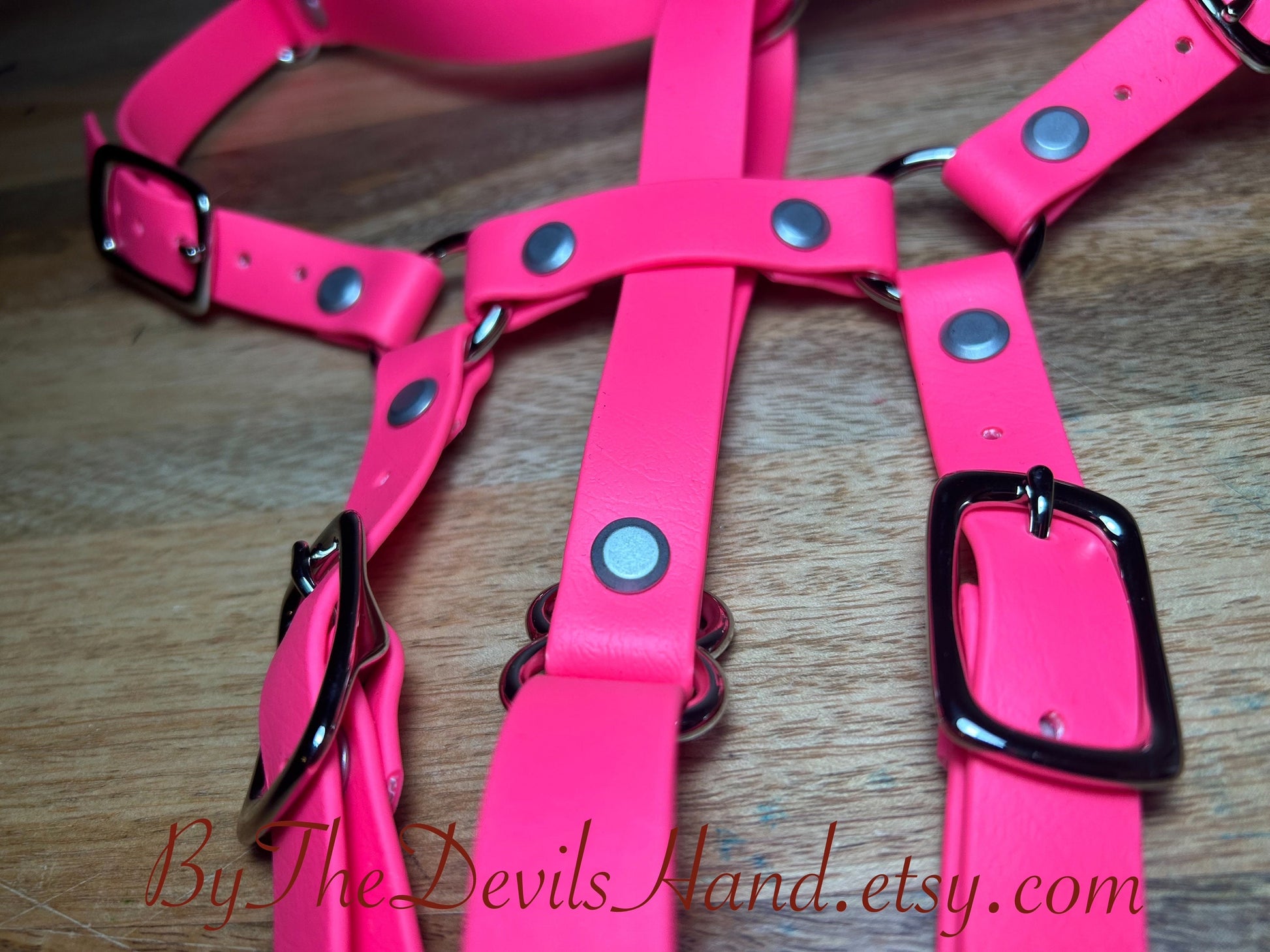 Crafted from high-quality vegan equestrian strap, this piece is available in Bright Pink, Classic Black, Cloud Blue, Lilac Purple, and Merlot Wine. If you’d like a two-tone harness, simply note your color preferences in the order details, and I’ll customize it for you. All buckles and rivets are sourced from a reputable domestic supplier, ensuring excellent durability and longevity. You won’t be disappointed with the design or craftsmanship—this harness is made for use with the original Hitachi Wand but works with any massager that meets the "neck" criteria.