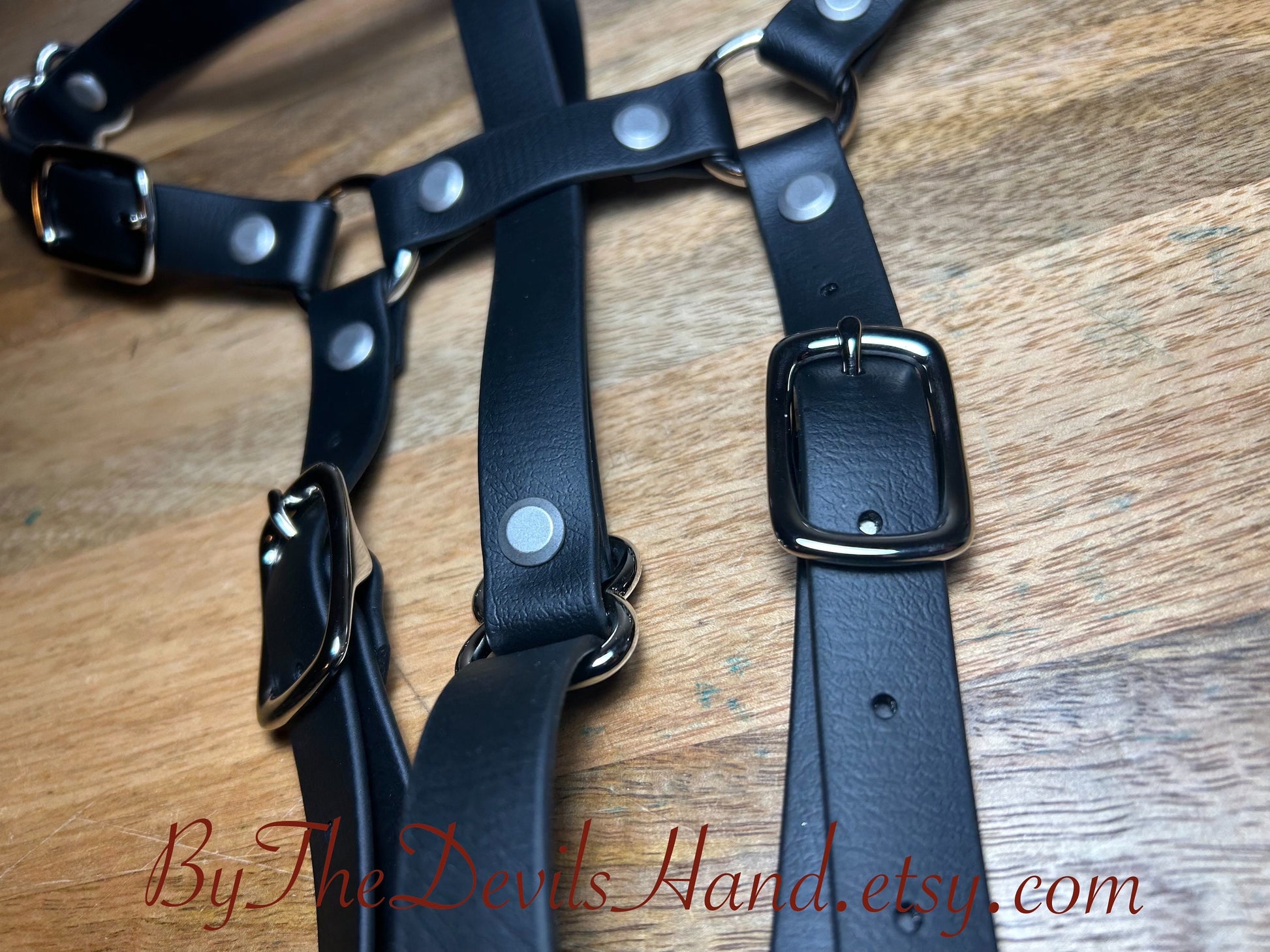 The vegan equestrian strap used in this harness is a top-tier alternative to traditional leather. It is paraben-free, non-toxic, hypoallergenic, and fully waterproof. The material is antimicrobial, latex-free, and sulfate-free, making it incredibly safe and easy to maintain. This strap is specifically designed for durability, featuring a weight rating of 500 pounds, and it won’t crack, peel, or lose its integrity over time. The soft texture and sleek finish of the material provide a luxurious feel, and it is incredibly resistant to wear.