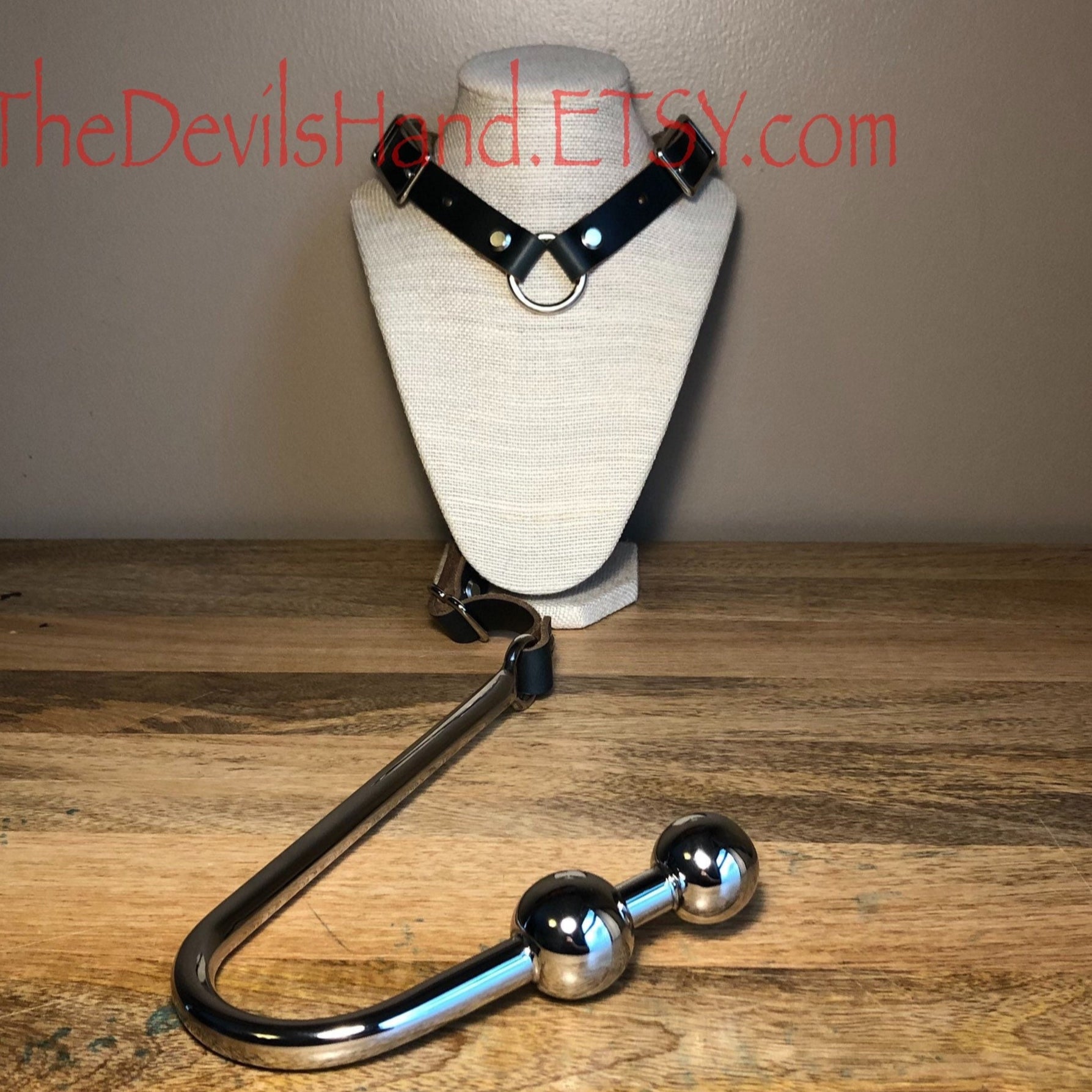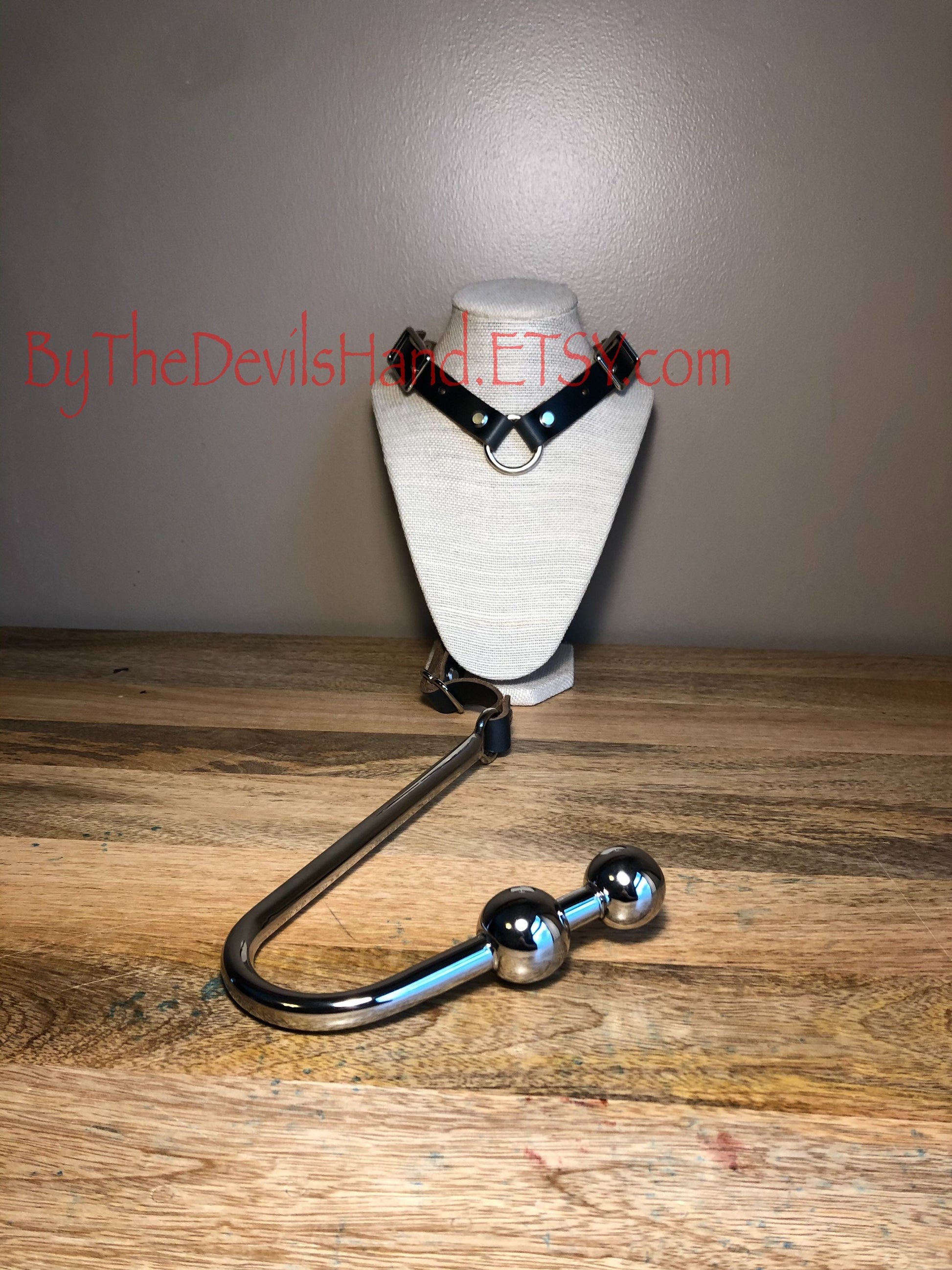 Anal hook with bondage rig to fasten the hook to your person/slave/sub’s neck. Back strap allows the hook to be tightened and fitted as desired. Collar is removable to be used independent of the rig, hook is removable as well to be used on its own.