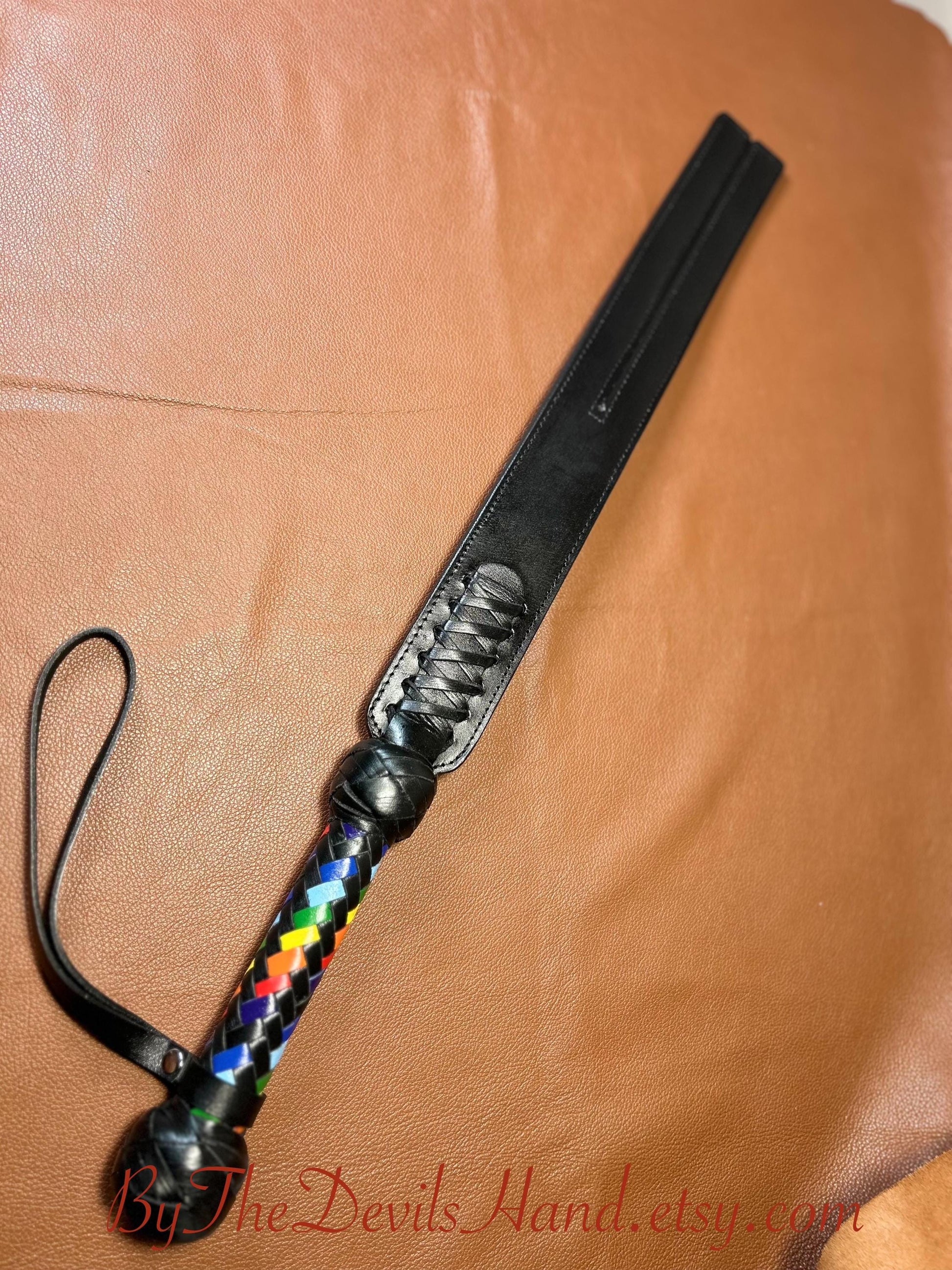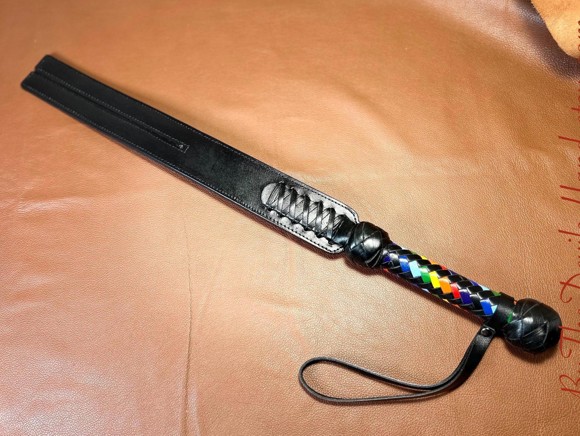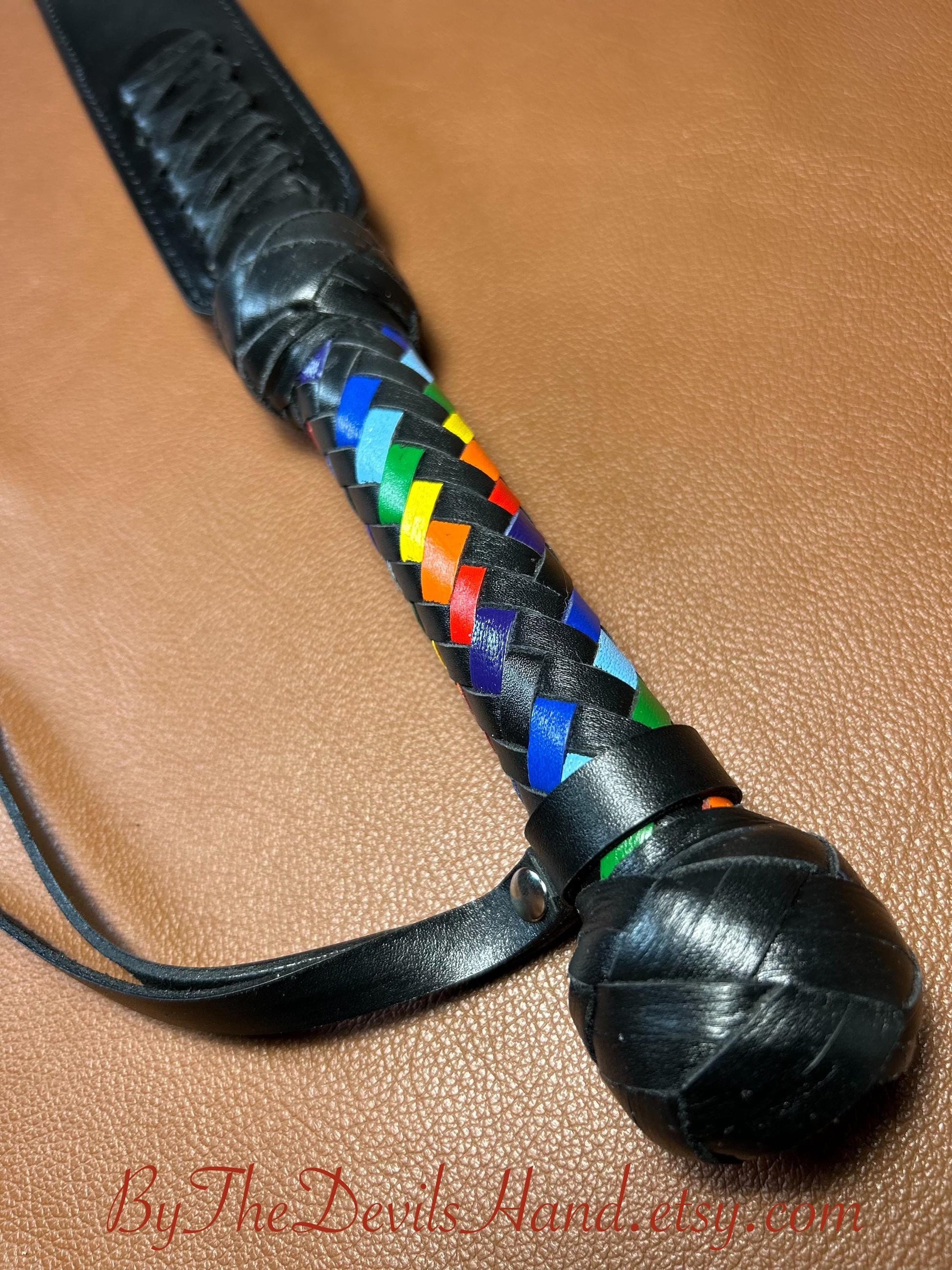 Mostly made of black leather with some bold rainbow colors added to the handle.