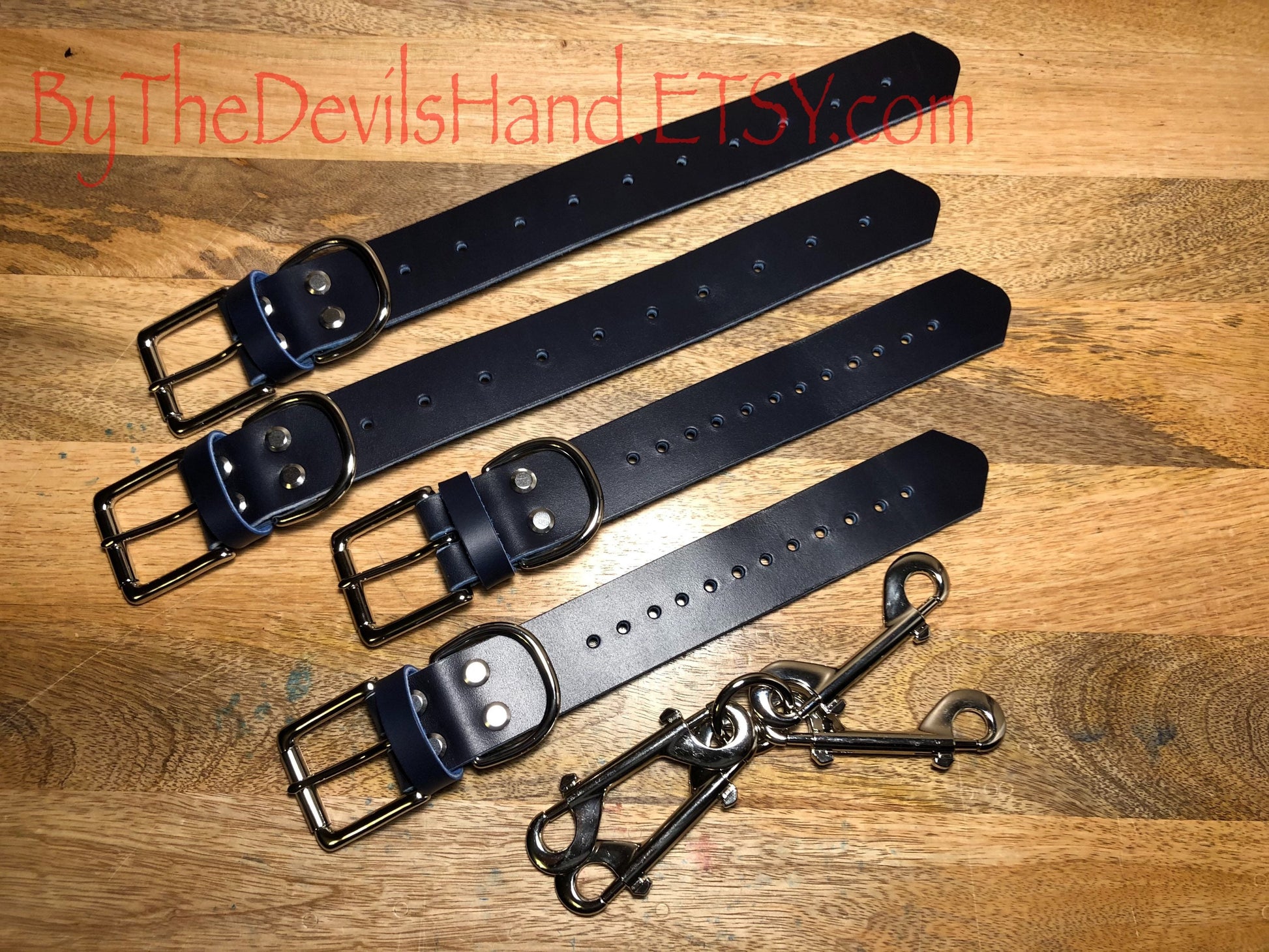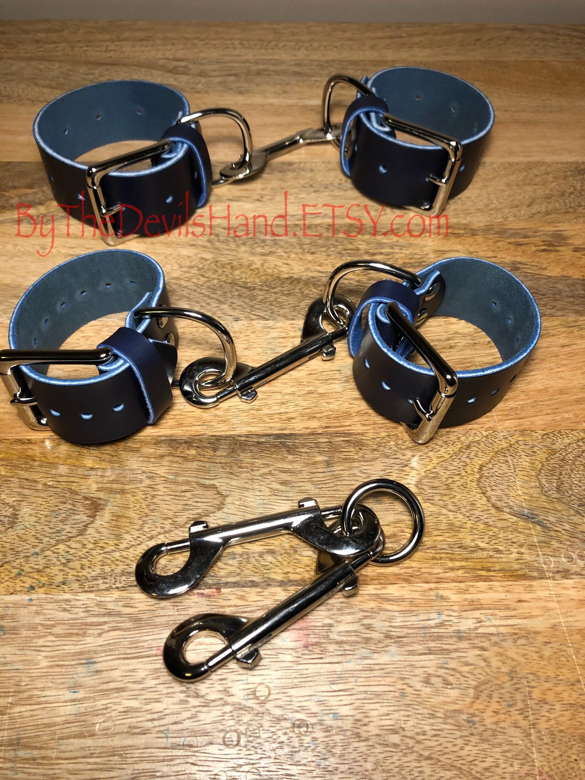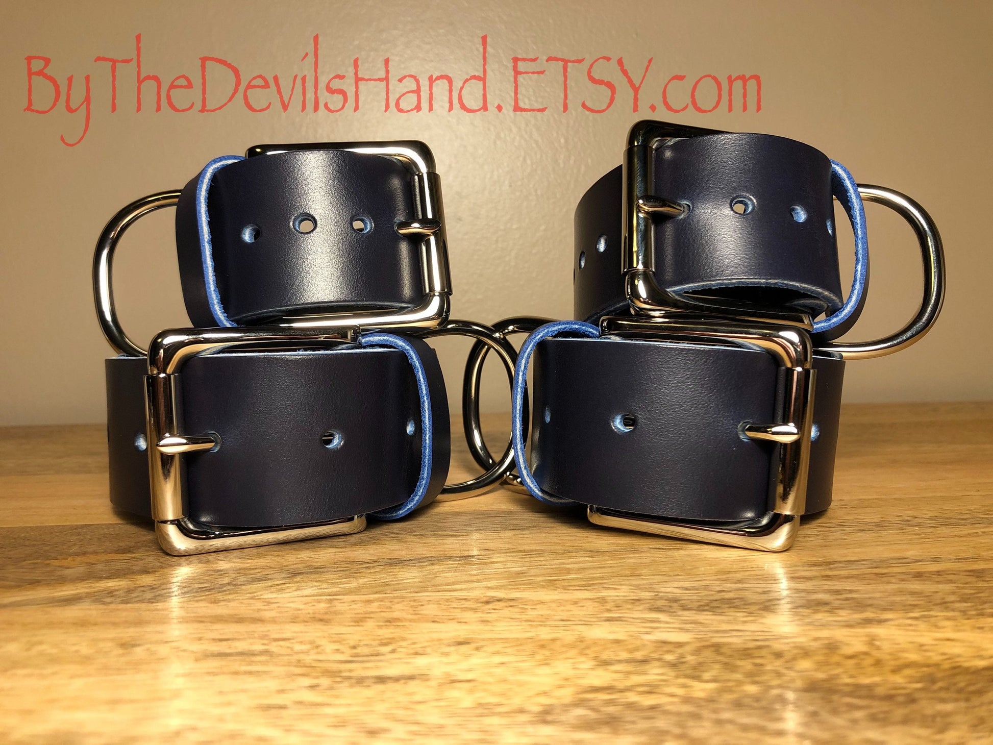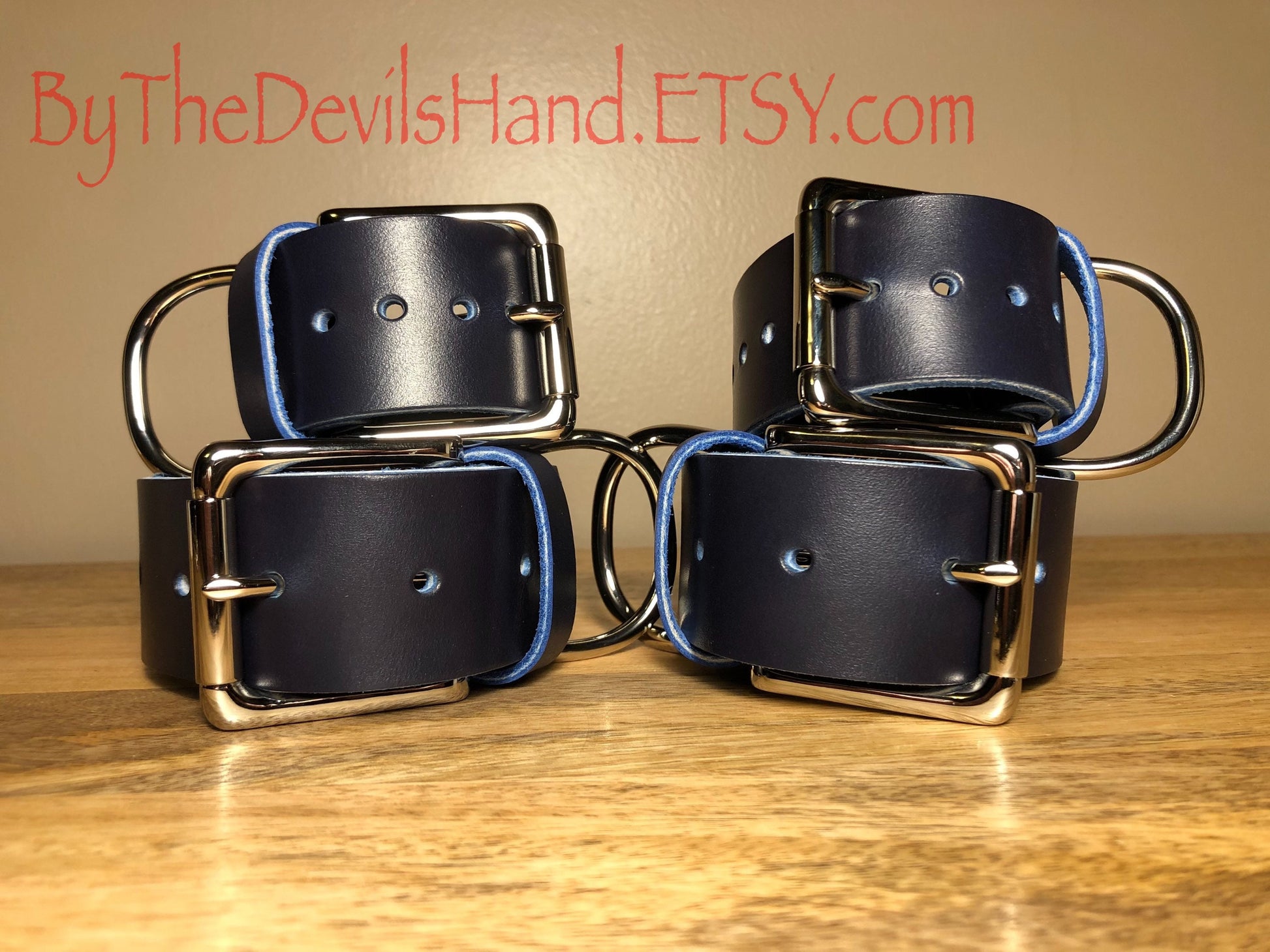 Wrist And Ankle Restraint Set - Handmade Cavalier Ink Pen Blue Leather Straps (CIP-BE)