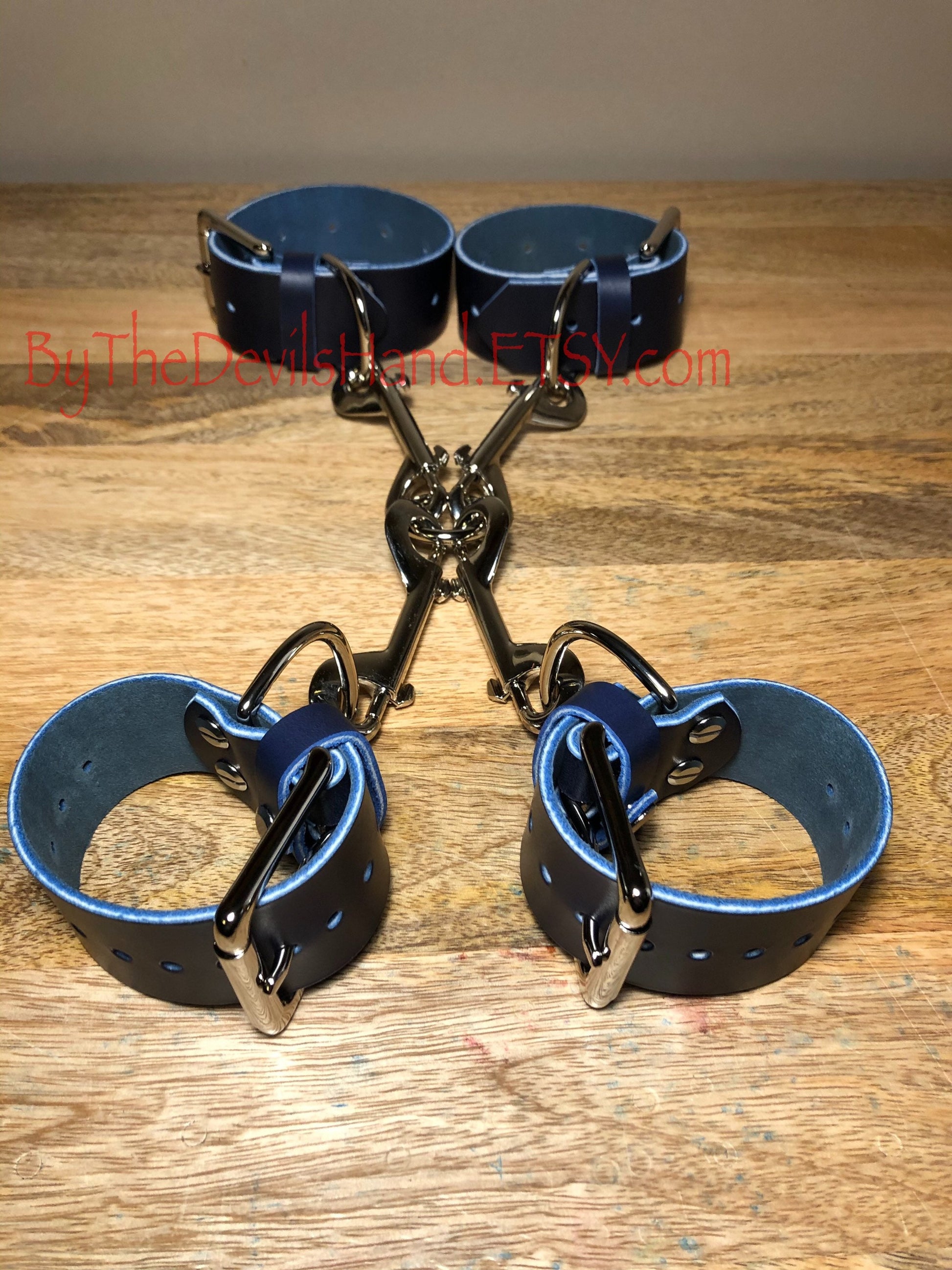 Complete restraint set. Single strap style, meaning each wrist and ankle will be secured with one heavy leather strap. Makes for a lovely aesthetic and a very functional rig.