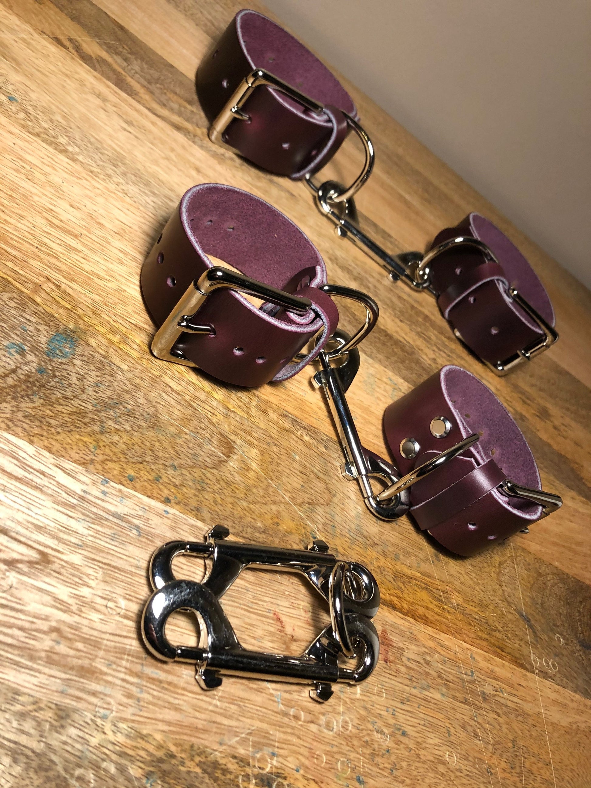 Complete restraint set. Single strap style, meaning each wrist and ankle will be secured with one heavy leather strap. Makes for a lovely aesthetic and a very functional rig.