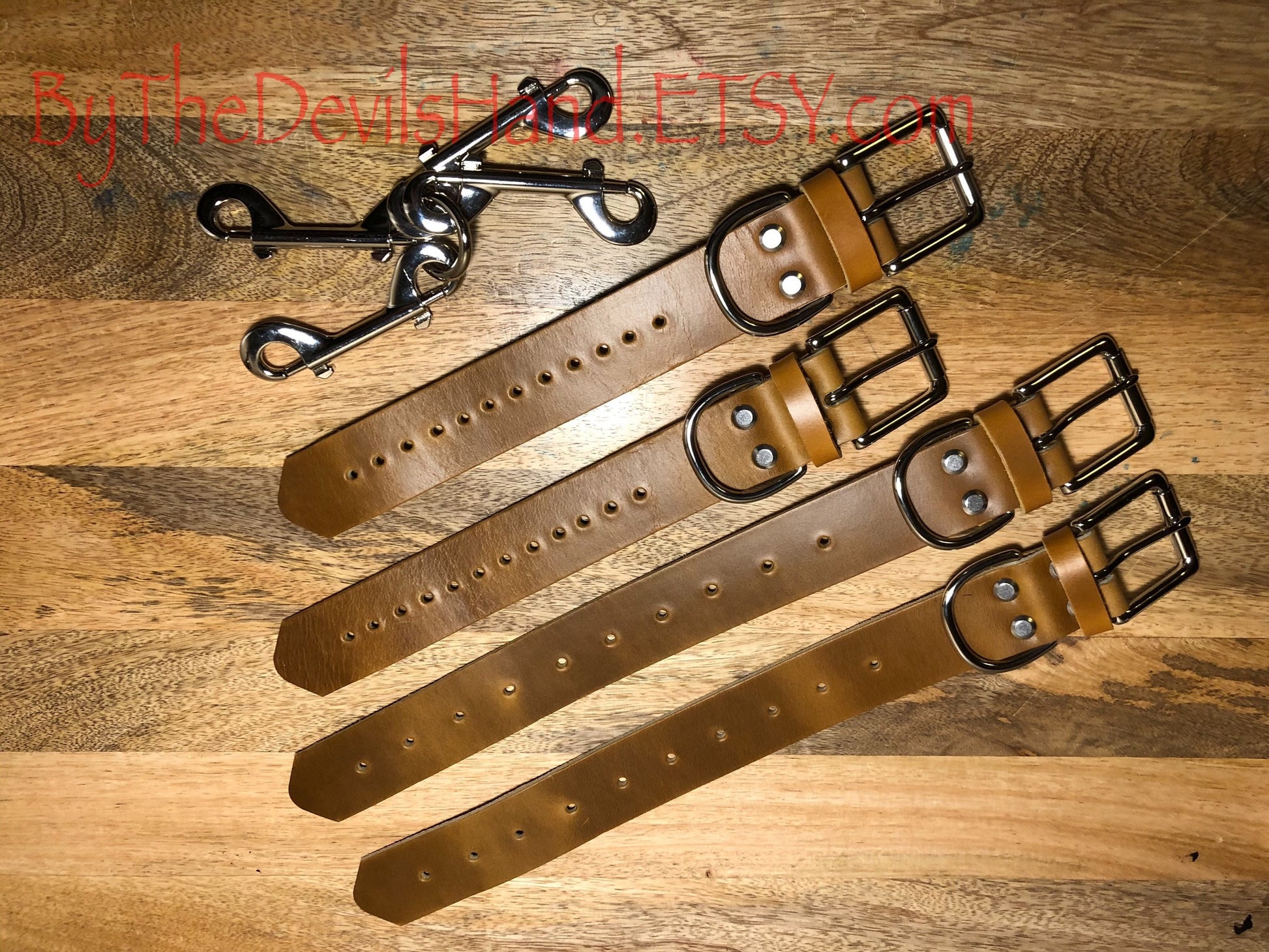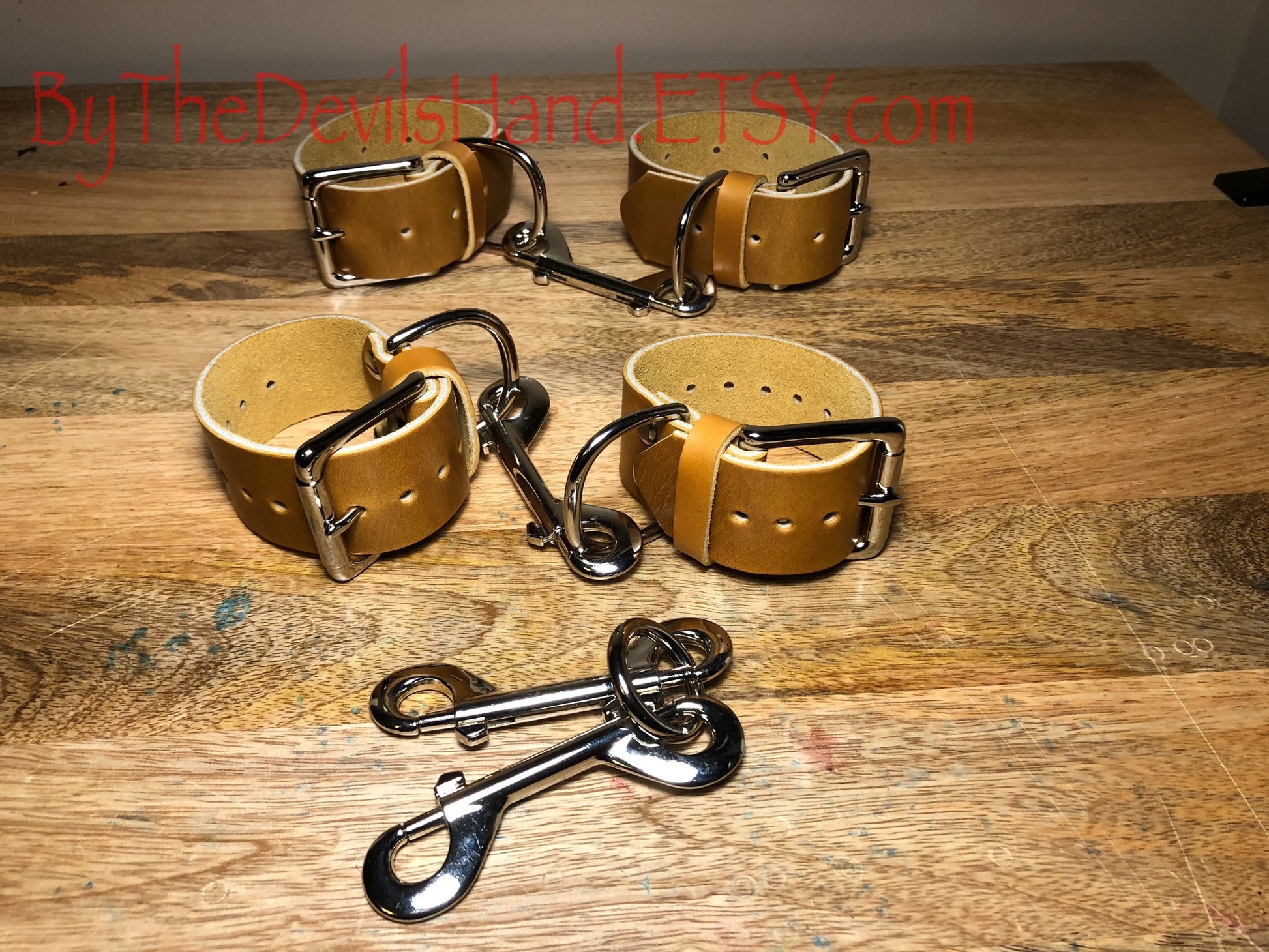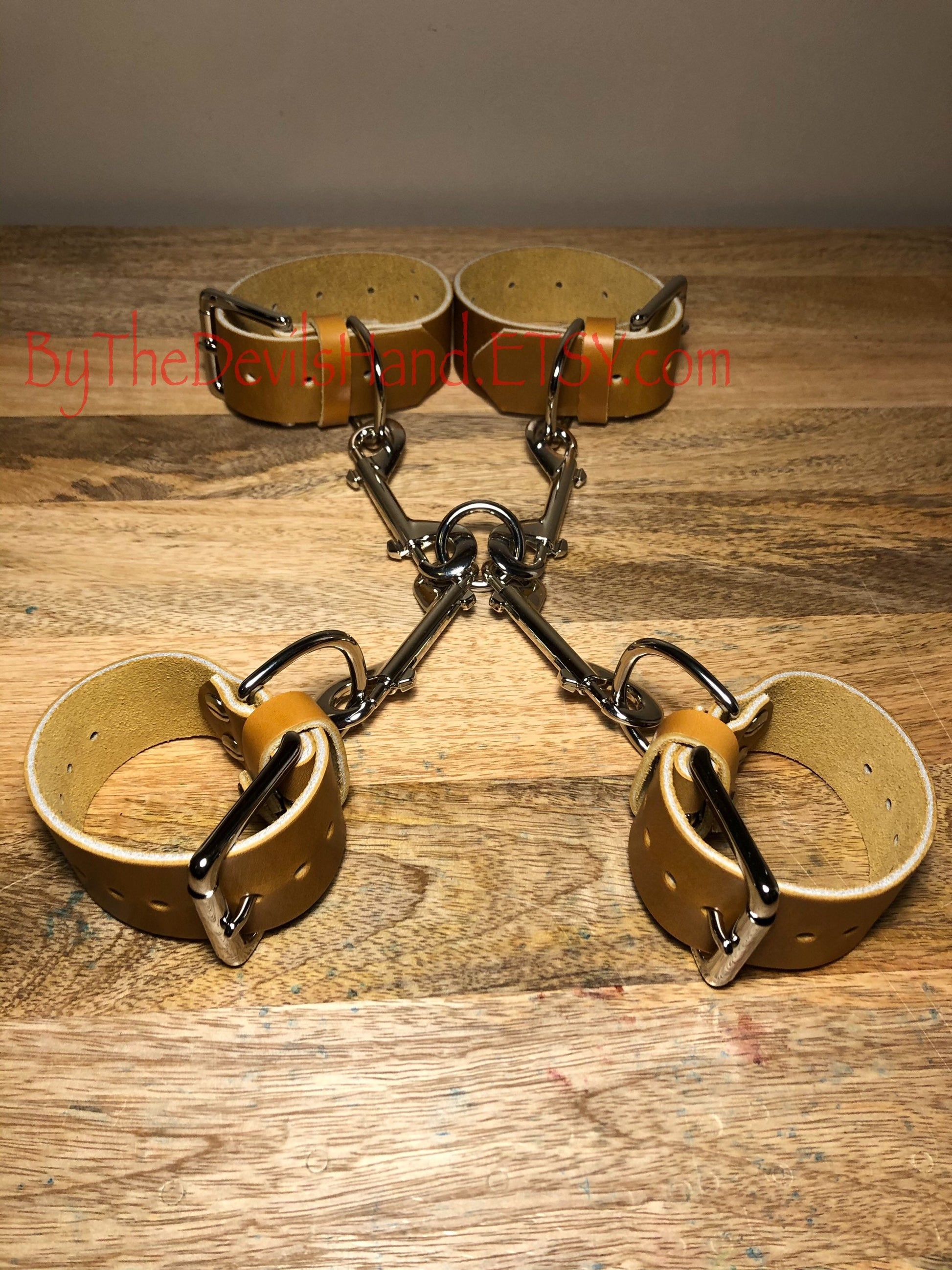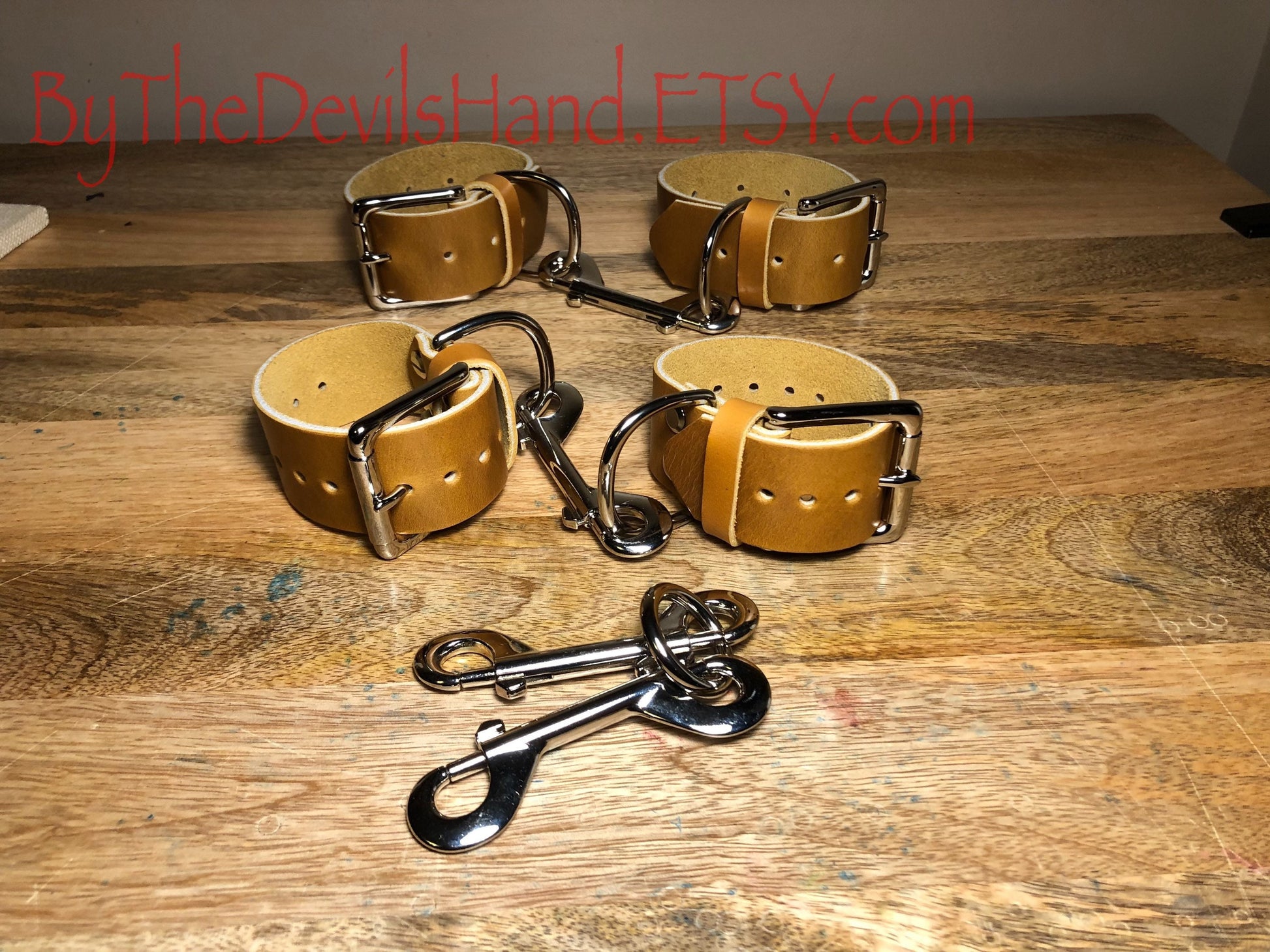 Complete restraint set. Single strap style, meaning each wrist and ankle will be secured with one heavy leather strap. Makes for a lovely aesthetic and a very functional rig.